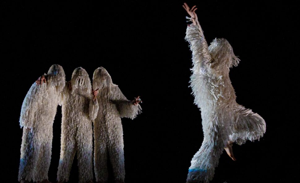 Quatre danseurs entrent en scène dans des costumes de franges blanches qui les enveloppent complètement. Quatre, c’est le leitmotiv de cette chorégraphie imaginée par Philippe Lafeuille et interprétée par la compagnie Chicos Mambo.