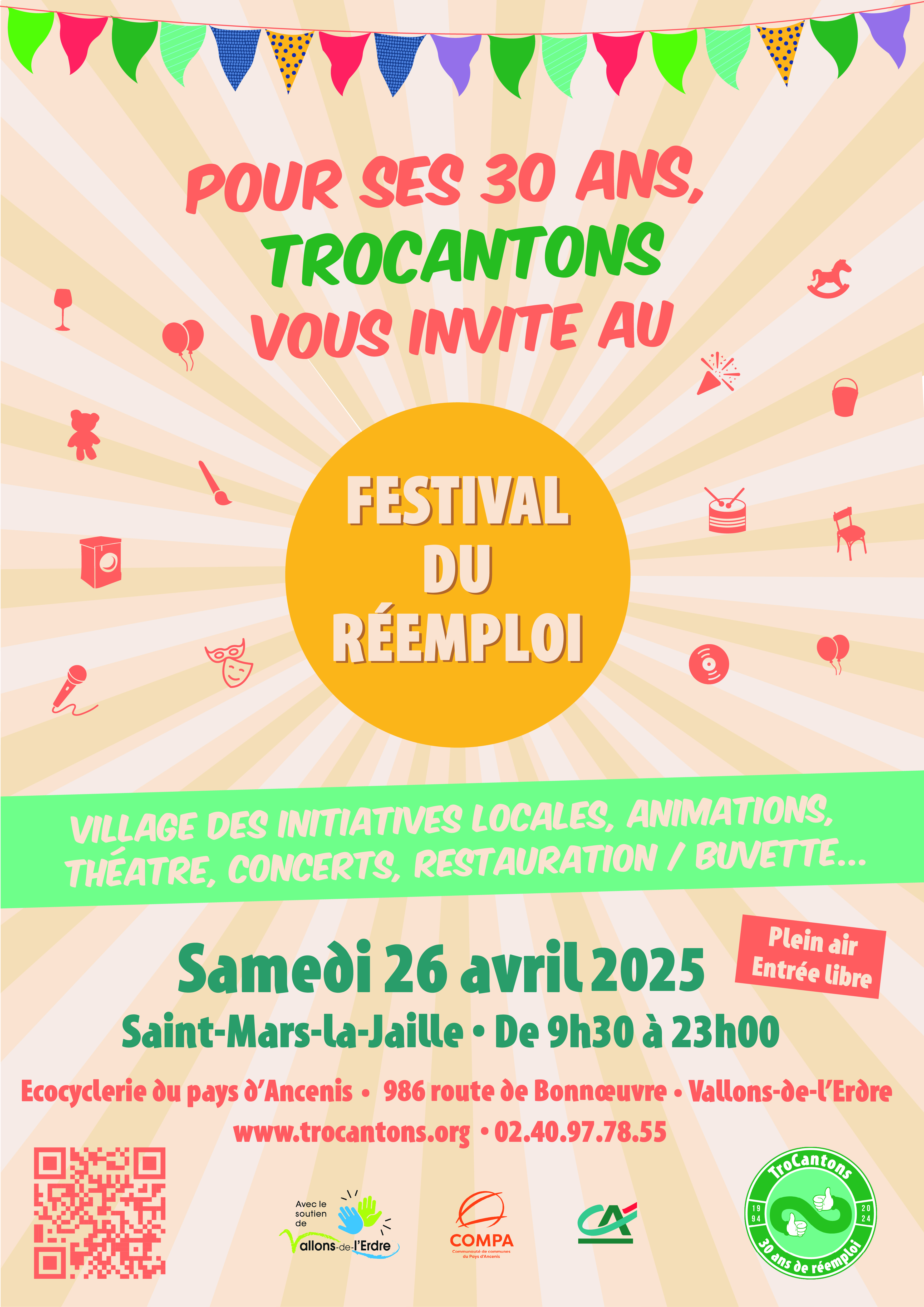 Samedi 26 avril prochain, le festival du réemploi chez TroCantons ! Voilà déjà 30 ans que dure l’épopée TroCantons, l’écocyclerie du Pays d’Ancenis. Aussi, l’association organisera le samedi 26 avril prochain sur le site de Vallons de l’Erdre, son grand festival du réemploi !