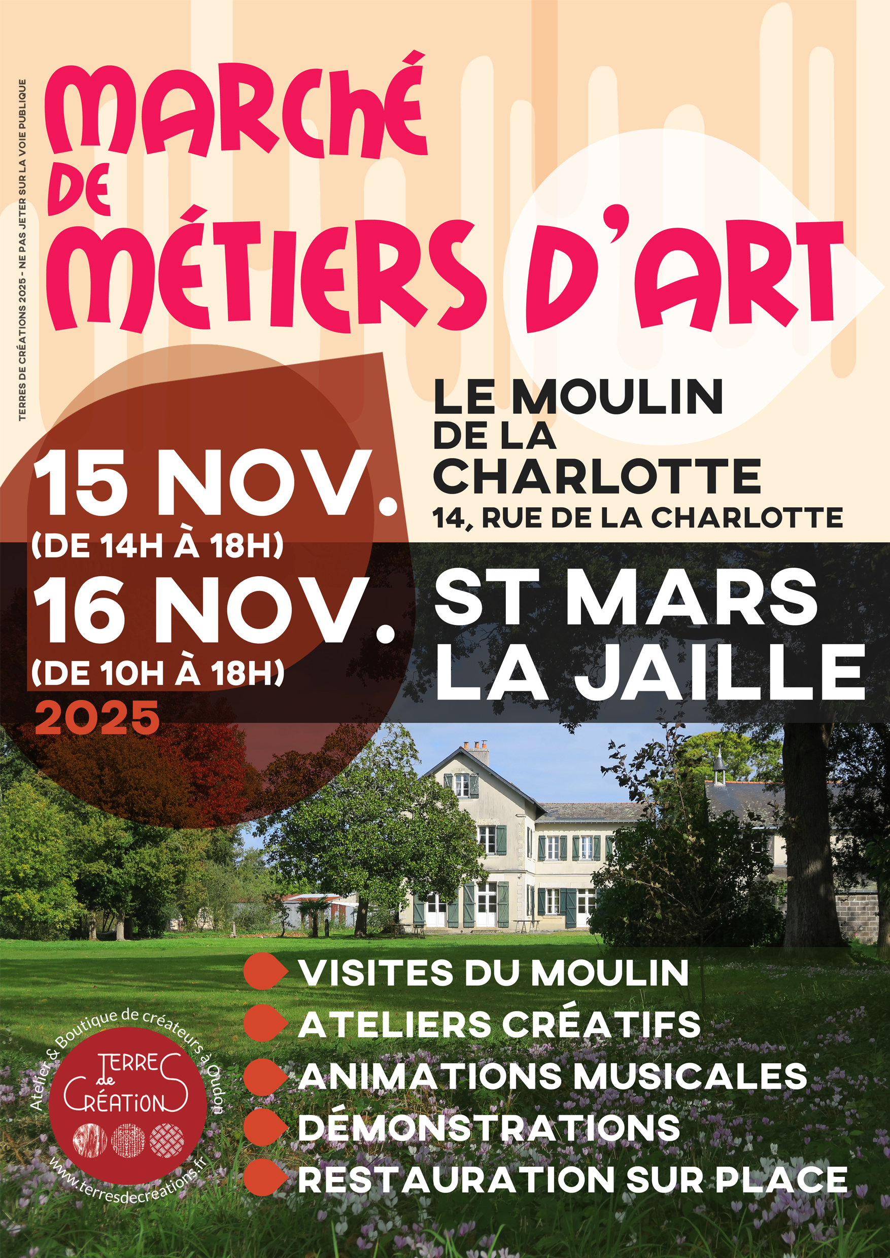 Le moulin de la Charlotte à Saint-Mars-la-Jaille ouvre ses portes les 15 et 16 novembre 2025 pour un marché de métiers d’art et d’artisanat et de découverte du moulin à eau du 18ème siècle, en collaboration avec l’association « Terres de Créations » basée sur la commune d’Oudon.