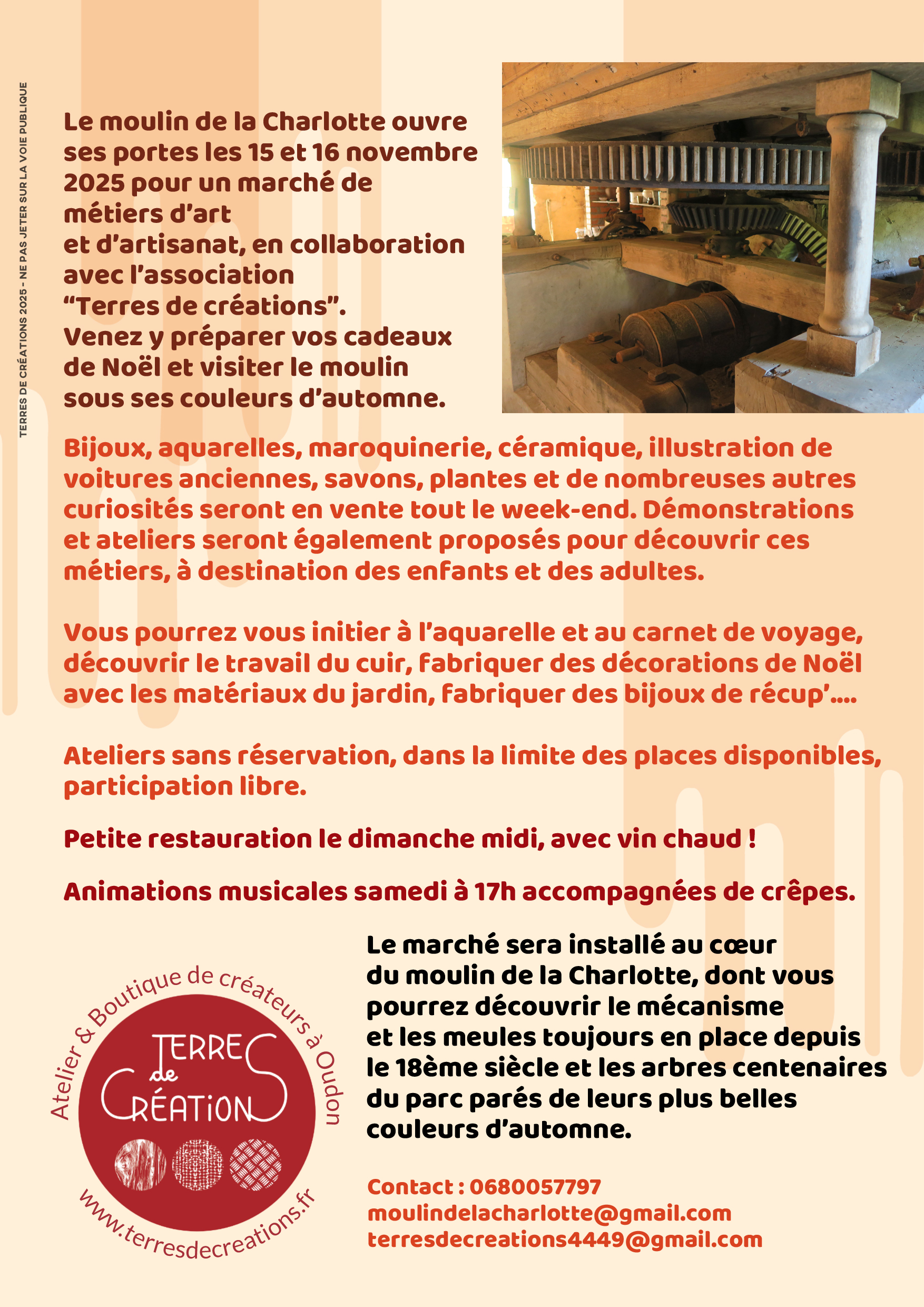 Le moulin de la Charlotte ouvre ses portes les 15 et 16 novembre 2025 pour un marché de métiers d’art et d’artisanat et de découverte du moulin à eau du 18ème siècle, en collaboration avec l’association « Terres de Créations » basée sur la commune d’Oudon.