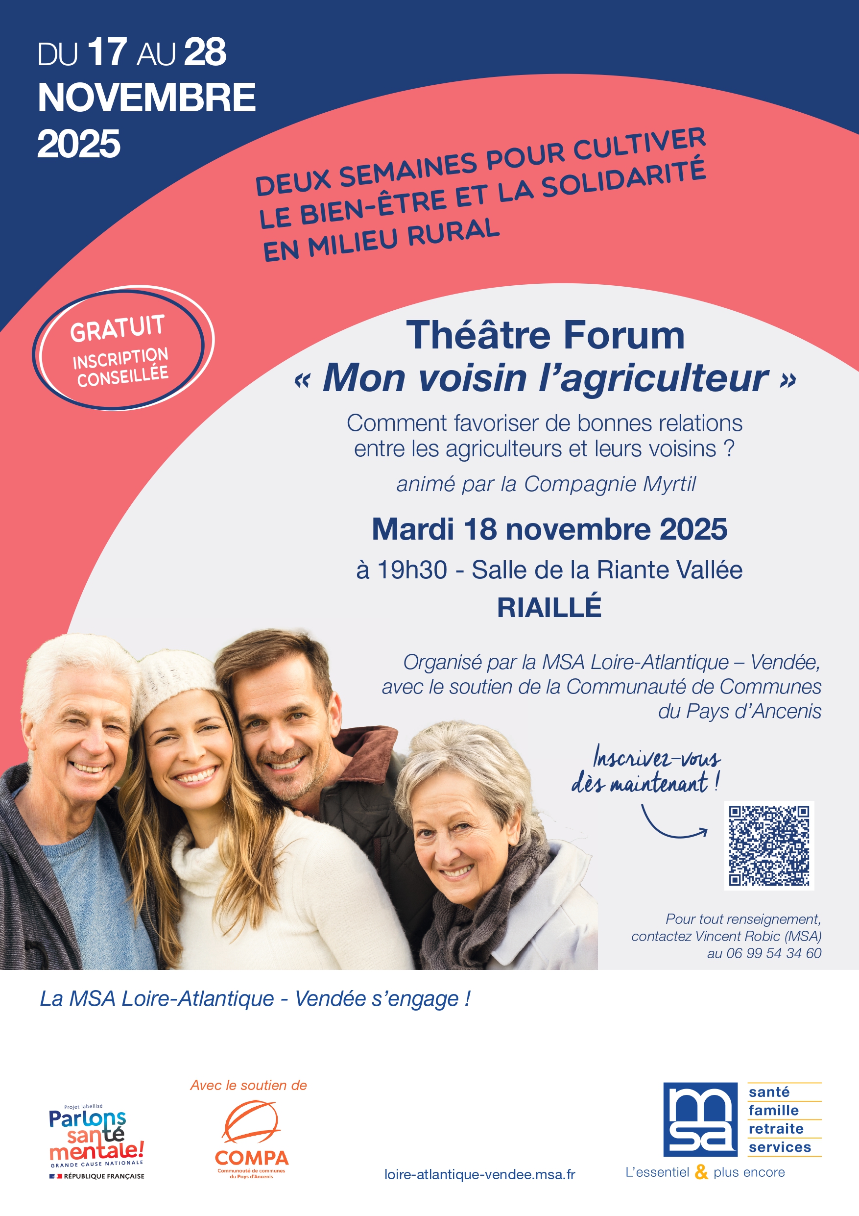 Ah, la vie à la campagne ! Le calme, les paysages… et les tracteurs qui passent devant chez soi ! Et ces odeurs ? Ça sent mauvais ou ça sent la vie rurale ? Parce que les clichés et les tensions de voisinage peuvent peser sur la santé mentale de chacun, la MSA Loire-Atlantique Vendée, en partenariat avec la Communauté de Communes du Pays d’Ancenis vous invitent à participer à un théâtre forum participatif. Sur scène, des situations bien connues du quotidien seront jouées… et vous pourrez, vous aussi, monter sur scène pour changer le cours de l’histoire !