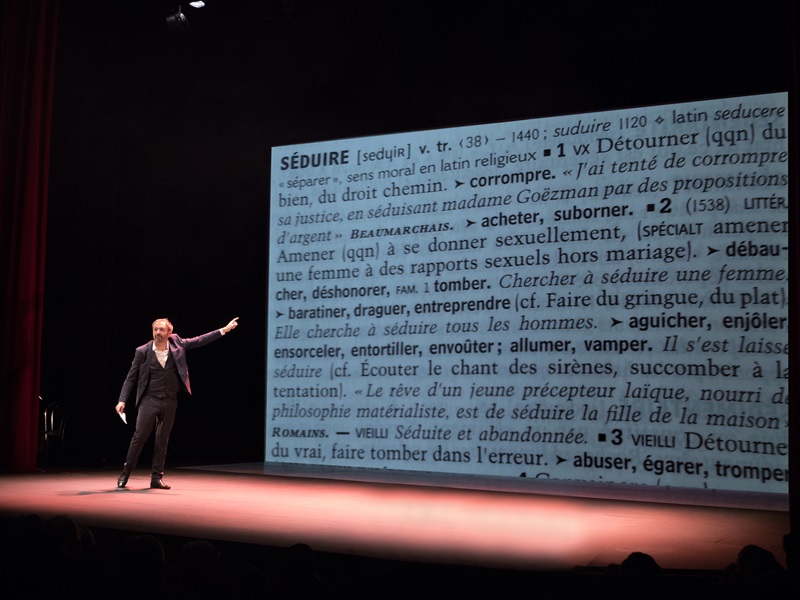 B comme Belle belle belle, D comme désir, I comme image, ou encore G comme galoche, T comme tango, X comme X, sans oublier Y comme youpi et Z comme Zorro. Dans ce seul en scène pétri d’humour et de fantaisie, le facétieux Jérôme Rouger aborde, sous forme d’abécédaire, les innombrables thèmes de la séduction. Séduire l’être aimé. Séduire le public. Séduire son chef. Séduire les foules. Séduire au premier regard. Comment ce besoin, cette envie de plaire influe sur la construction de nos personnalités et la société dans laquelle nous évoluons ?