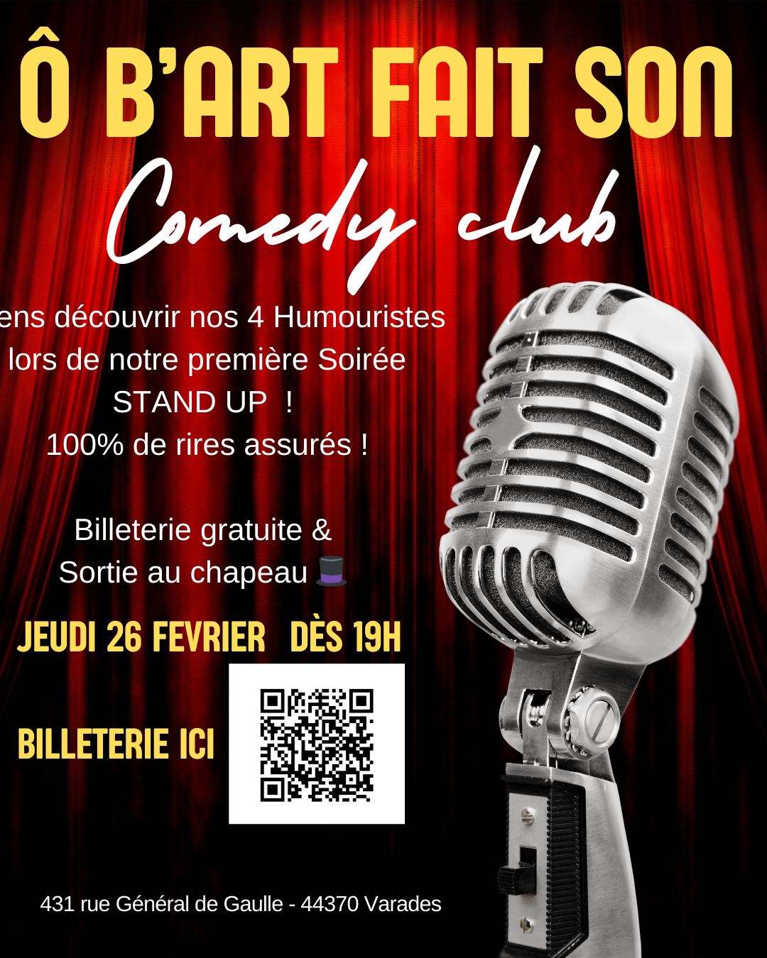 Ô’B’ART fait son show, venez découvrir 4 humouristes pour cette première soirée Stand-Up.