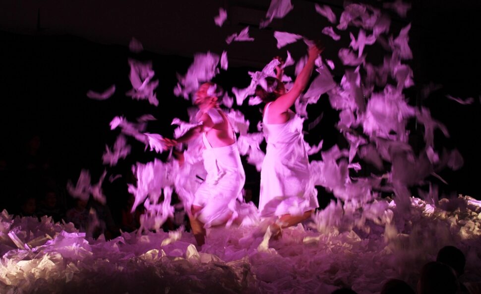 Un épais manteau de neige recouvre le plateau. Un paysage fait de papiers de soie, blancs, froissés, enchevêtrés. Guidés par la magie de la musique et de la lumière, deux drôles de personnages éveillent les créatures enfouies dans cette blancheur. Sans un mot, ils ouvrent les portes de l’imaginaire en jouant avec la matière et l’émerveillement de la métamorphose. Alors les papiers se défroissent, et c’est un poisson qui déploie ses ailes, une mer qui se déchaîne, des lunes qui dansent… un dragon peut-être… Et le papier, peu à peu, s’envole jusqu’au public, comme pour l’inviter lui aussi à jouer. Avec une infinie douceur, ils nous convient à cette rêverie merveilleuse.