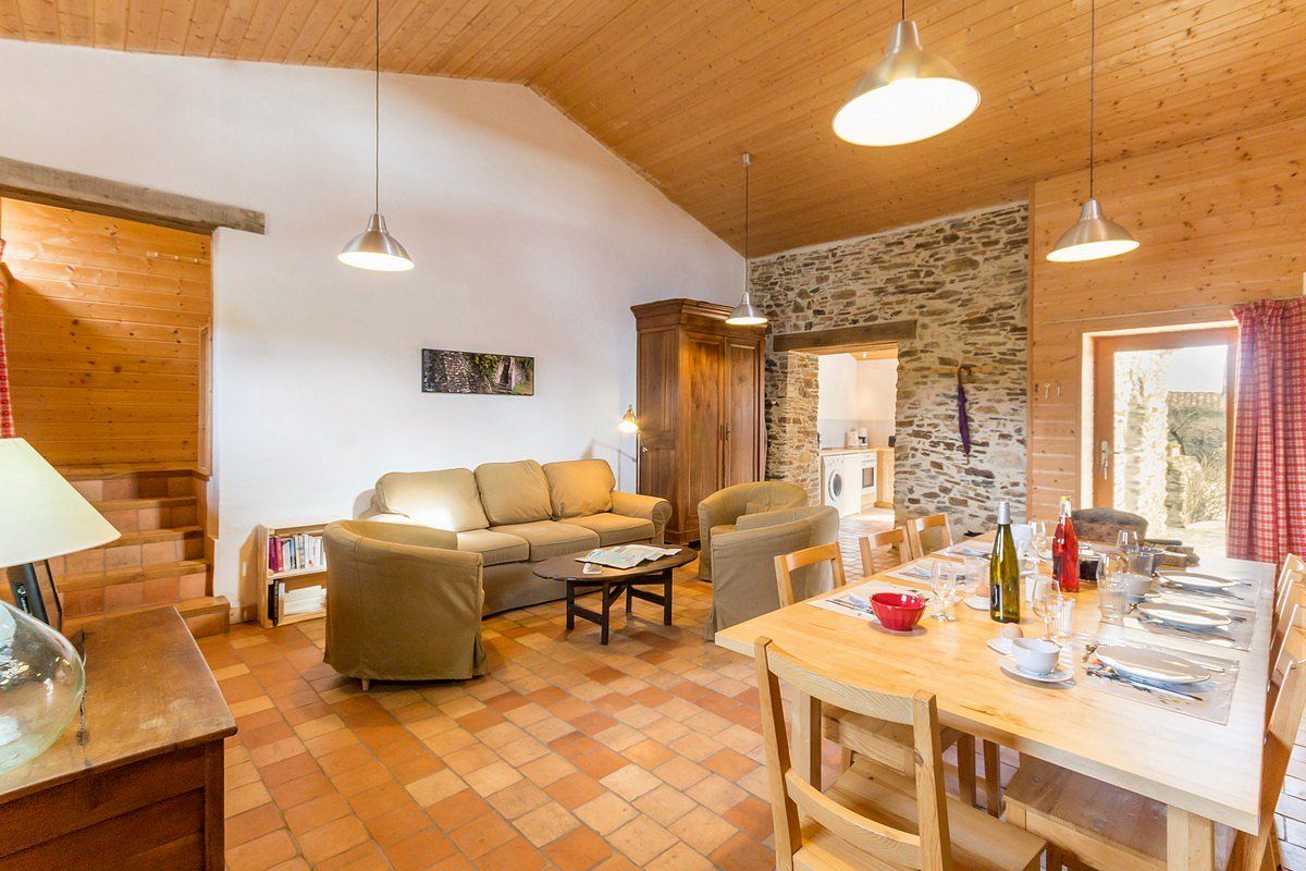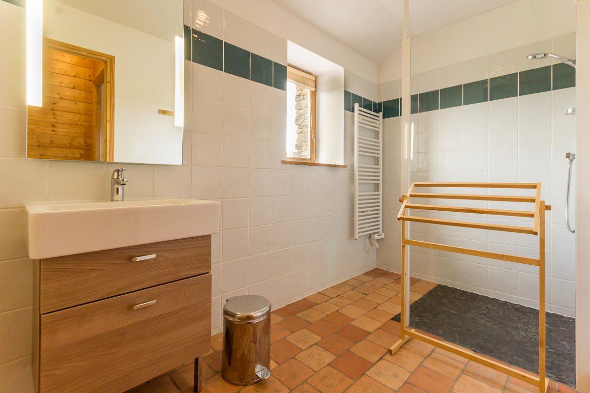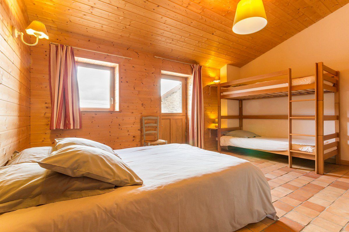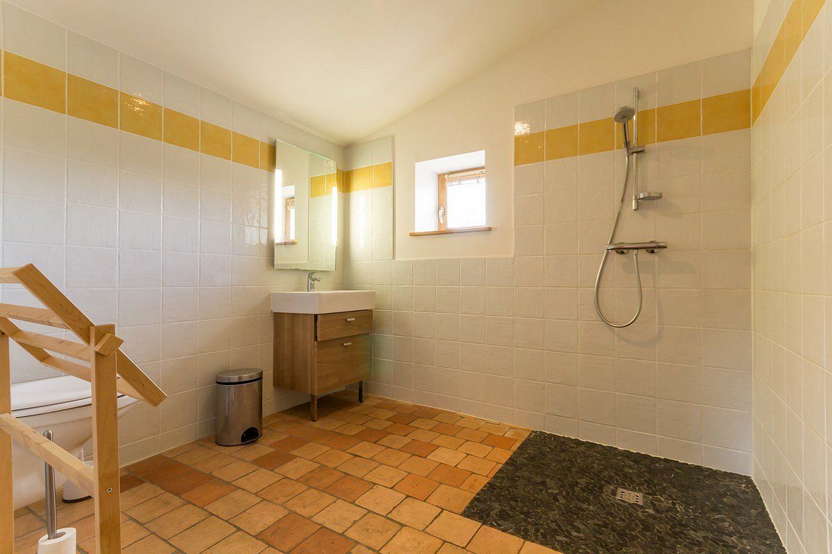 Salon/séjour avec cuisine ouverte, 1 chambre (lit 140×190) avec s.d.e/wc privatifs, 1 chambre accessible par 5 marches (1 lit 140×200 + 2 lits superposés 90×200), s.d.e et WC indép.