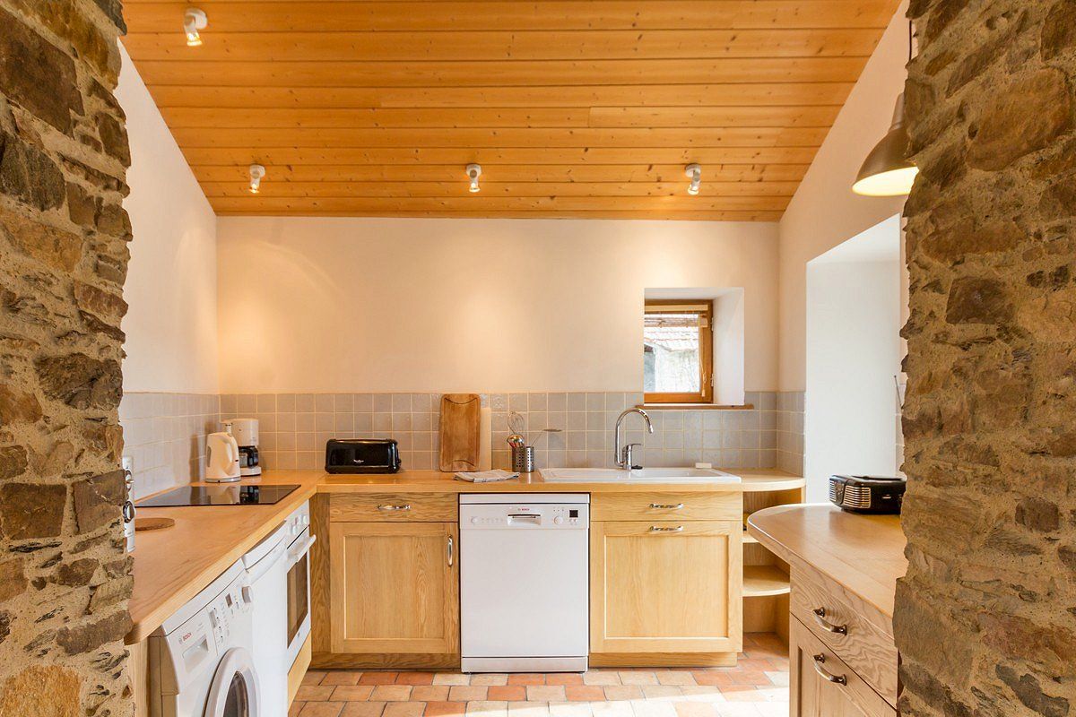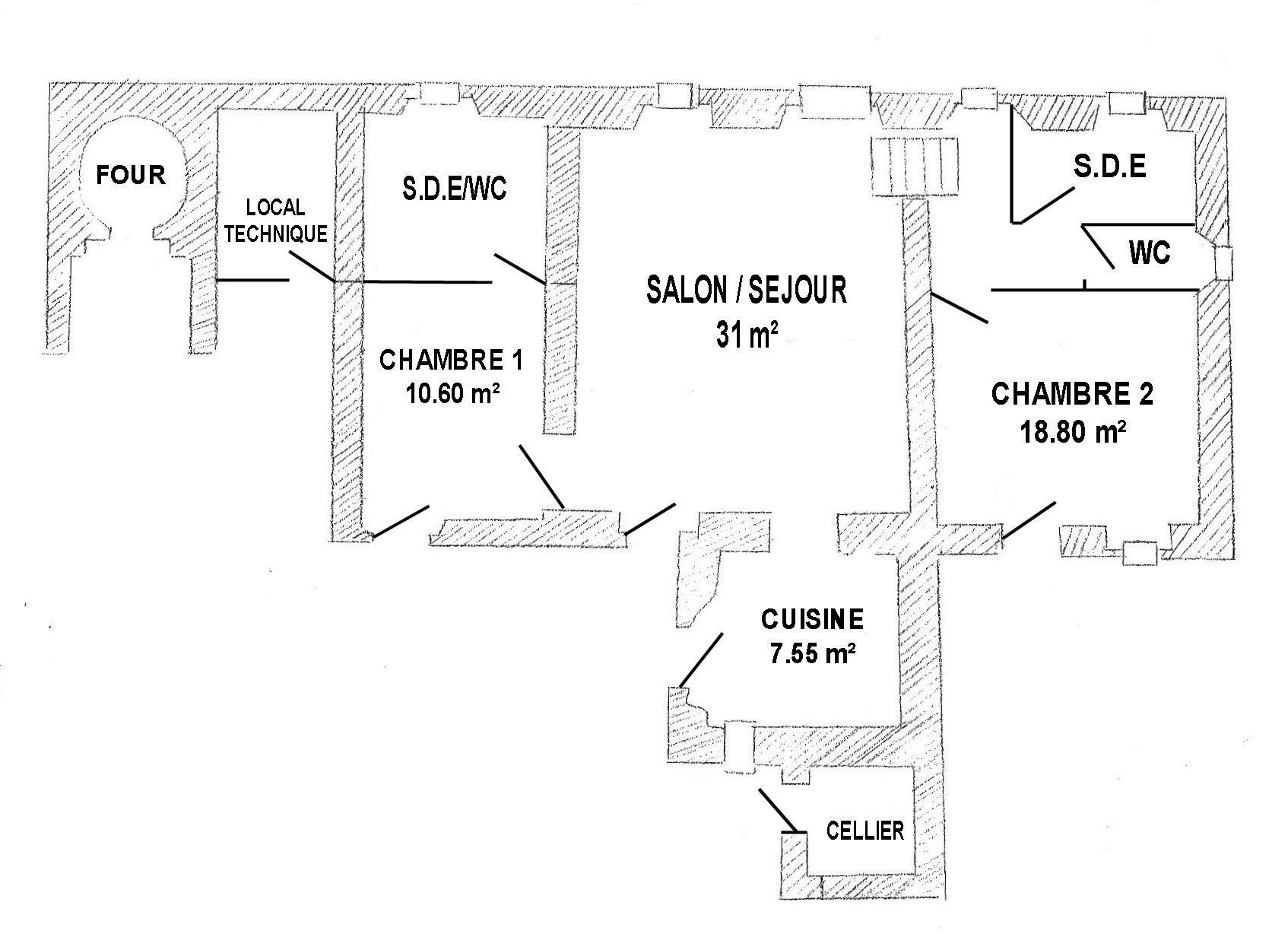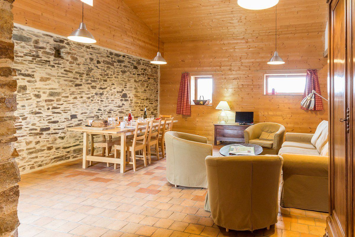 Salon/séjour avec cuisine ouverte, 1 chambre (lit 140×190) avec s.d.e/wc privatifs, 1 chambre accessible par 5 marches (1 lit 140×200 + 2 lits superposés 90×200), s.d.e et WC indép.