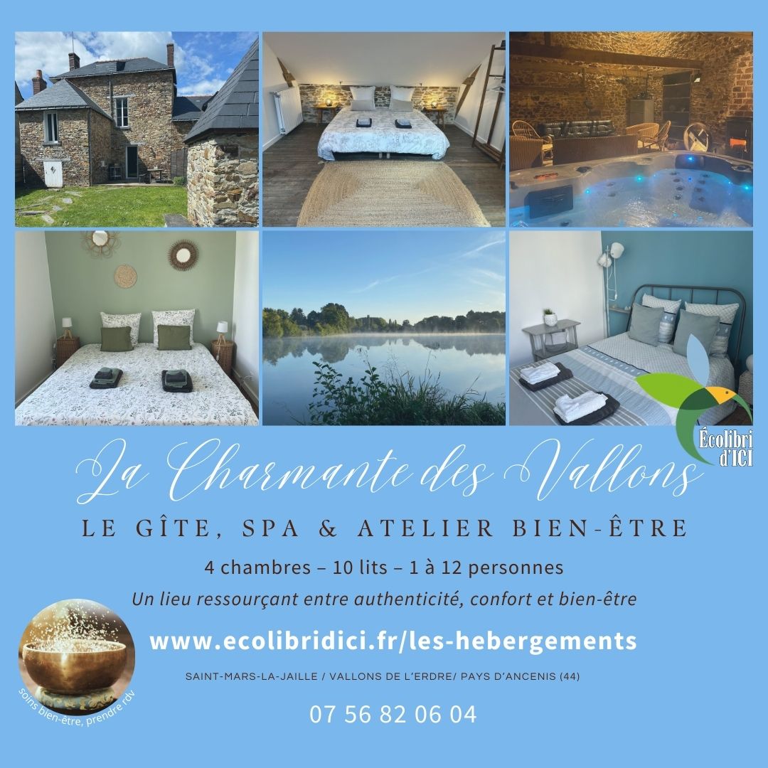 La Charmante des Vallons & son SPA est une maison bourgeoise de charme située au cœur de Saint-Mars-la-Jaille, à deux pas du plan d’eau des Lavandières. Gîte avec jardin clos et dépendance bien-être en pierre de 42 m² avec SPA privatif chauffé toute l’année, idéal pour un séjour nature et détente.