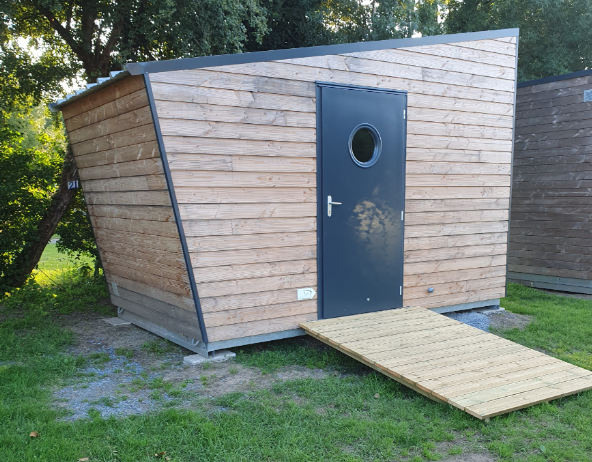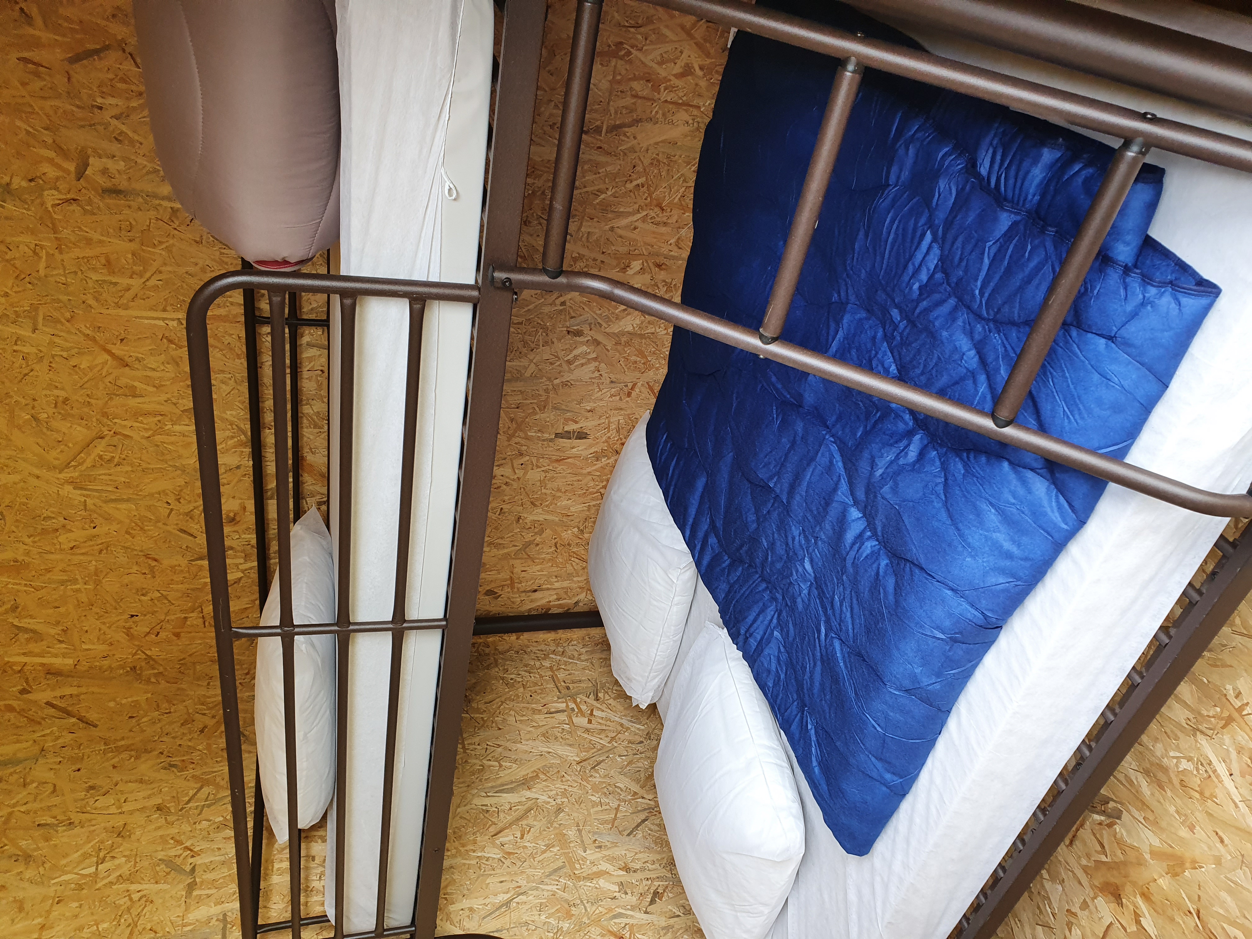 Cabane en bois de 8m² où vous y trouverez un espace couchage fermé équipé d’un lit superposé avec lit double en bas et lit simple en haut (+ couettes et oreillers) et la possibilité de ranger vos vélo en toute sécurité.